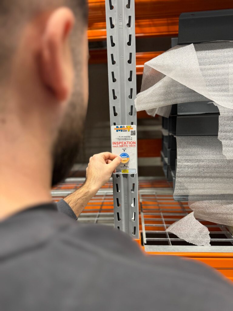 Fachmännische Inspektion von Regalanlagen gemäß der europäischen Norm DIN EN 15635, um Sicherheit und Stabilität zu gewährleisten.